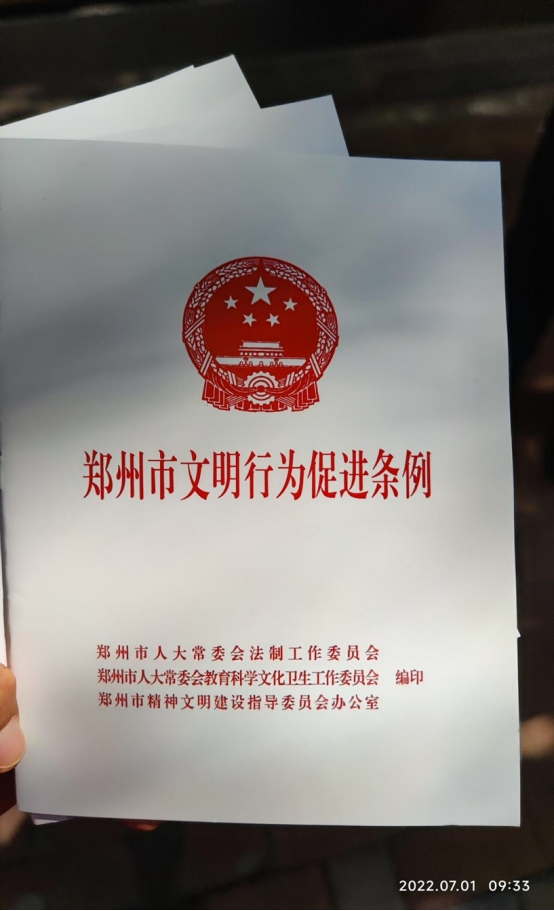 2022年7月1日,是《鄭州市文明行為促進條例》頒布實施四周年紀念日。我校第四黨總支于上午9:00在優勝校區周邊開展以“學習宣傳踐行條例,做文明有禮鄭州人”為主題的黨日活動。第四黨總支的黨員志愿者充分發揮榜樣引領作用,以身示范,做《條例》宣傳和踐行的先行者。廣泛開展進基層宣傳活動,向轄區內市民群眾發放《條例》,并進行解讀,打通服務群眾“最后一公里”,將《條例》宣傳送進千家萬戶,擴大宣傳覆蓋面,進一步加深廣大居民對《條例》的理解和認識。